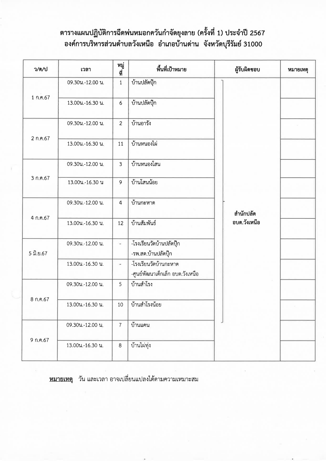 ตารางแผนปปฏิบัติการฉีดพ่นยุงหมอกควันกำจัดยุงลาย ประจำปี 2567